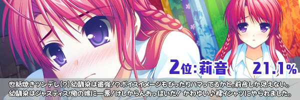 大変遺憾でございます いえ、何がイカンかと言いますと、人気投票の結果でもなんでもなく、 昨日作った豆腐ハンバーグのことをすっかり忘れて外食してしまい 人知れず放置され続けていると思うと涙が出てきます。 ……本題へ戻りましょう。 最初の週は幼馴染エースこと莉音がトップを飾っていたのですが、 その後はレティの独壇場。 ぐんぐん他キャラクターを引き離し、独走そのままでゴールイン。 お正月のお茶の間で見たことのあるような流れですが、気のせいでしょう。 おめでとうございます、ラインさん。あなたのその気さくなところが大好きです。 さて、引き続きまして堂々の2位を飾った莉音。 優等生なのにぐーたらであったり、少しだけダークなところやYシャツ姿に ノックダウンされた方も多いかと思われます。 個人的には、コメントで胸部のふくらみに関するイジリが少なかったことが、少し寂しく感じられます。 みなさん、もっとイジって頂てください。もっと、もっと。 しかし、第一週では1位に輝いた実力から、今後の延びしろが十分期待されます。 おめでとうございます、織倉さん。あなたのそのおせっかいなところがたまりません。 こちらも第二週からひっくり返してそのまま走り続けた春子さん。 クールキャラかと思いきや、おっとどうしたことか天然でしたとさ。 だがしかし、それがいい。という方や、年上お姉さんがお好きな方からの応援が殺到しております。 ヒロインの中で一番大人びて見える。という辺りがすごく魅力的なのかと思います。 私としましては、色のバランスが非常に好みのキャラクターなので、 彼女が画面にでたとたん、なにやら華やかになった気さえします。 おめでとうございます、勇那さん。あなたのそのツッコミ所満載なところに惚れ惚れします。 まだまだ続きます。 第4位は天原のお姫様ことあきらさんでございます。 「ニーソ」「うさ耳」と高ポイントアイテムを持ちながらも、あと一歩及ばなかった辺り、 必殺のお姫様モードが体験版に乗っていなかったことが原因かと思われます。(たぶん) 彼女の魅力はその天真爛漫さとちょっぴりダークな併せ技ではないでしょうか。 非常に好きです。大好きです! 彼女のかわいさに癒された方は多いのではないでしょうか? 頂いた応援メッセージも、非常に力の入ったコメントが多数寄せられています。 彼女もまた、そのポテンシャルの多くを未だその身に秘めているので、 次回の人気投票結果が楽しみなキャラクターでもあります。 おめでとうございます、あきらさん。あなたに是非とも悪戯されたいと日々思っています。 第五位は、「フェイクアズール・アーカイブ」でおなじみのノエルさん。 猫です。まさかの追い上げに少しびっくり。 でもいいんです。ノエル好きなので。 体験版では出番は少ないですが、サイドストーリーやアーカイブをはじめ、 本編での出番は非常に多いので、ノエル派のみなさんには満足していただけるのでは、と思います 。 お疲れ様でした、ノエルさん。猫でもいいんで付き合ってください。 個別での紹介はこれで最後。 ラストは第六位に輝いた、お隣のお姉さんこと由利さんです。 このコメントを書きながら、上のイベントCG画像を見ているのですが…… あ、れ? おかしいです。こんなに胸がしめつけられるなんて。 ほんわかお姉さん良いですね。やわらかい笑顔がとても素敵です。たまりません。 お疲れ様でした、由利さん。今度個人的な壁紙を作りたいと思います。 以上、長くなってしまいましたが今回の結果発表コメントをしめさせて頂きたいと思います。 残る方々は、本編をお楽しみに……。ということで、彼らの活躍の場をご期待ください! |